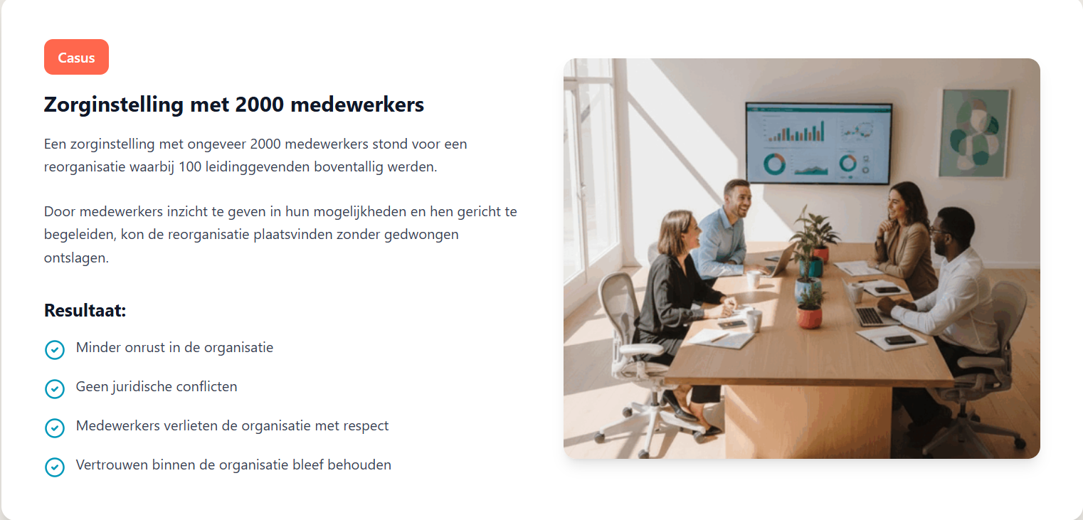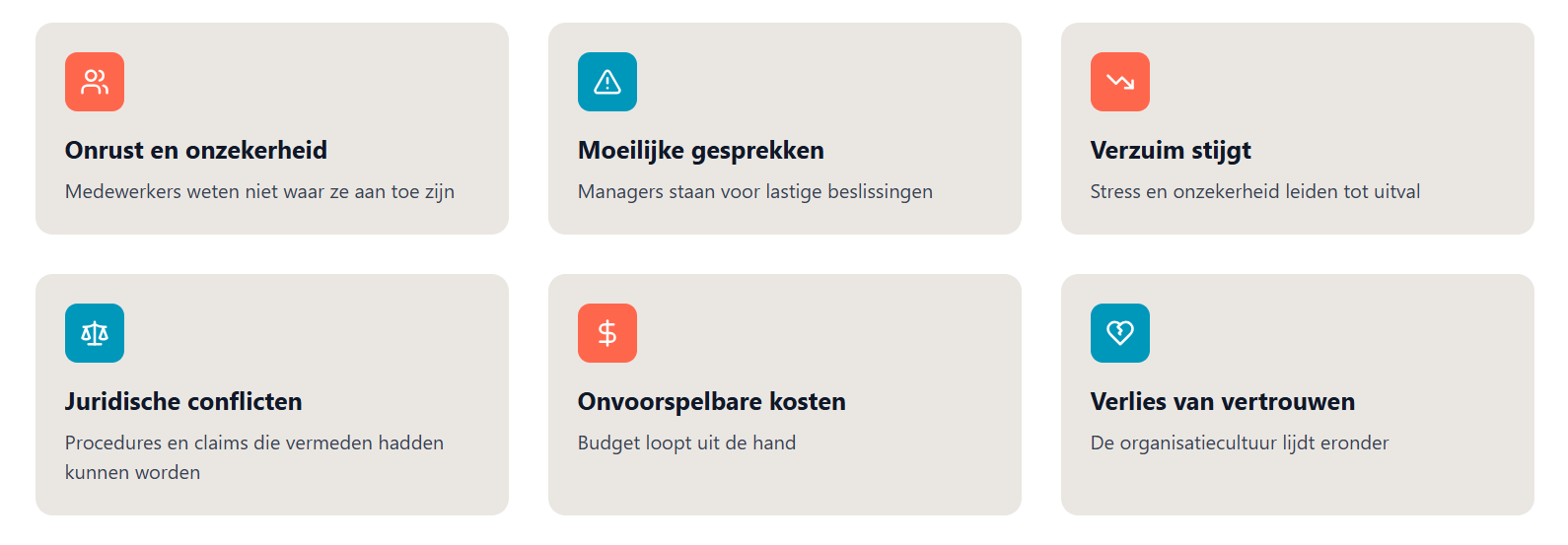 Zonder duidelijke regie kan een reorganisatie leiden tot onrust, oplopend verzuim, juridische conflicten en verlies van vertrouwen binnen de organisatie.