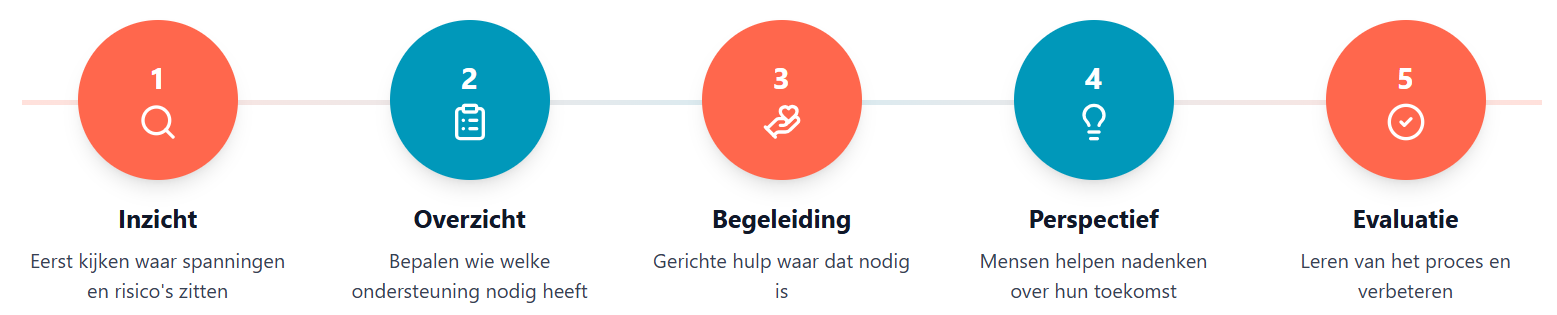 In plaats van losse trajecten en ad hoc beslissingen wordt gewerkt met een duidelijk model waarin inzicht, begeleiding en besluitvorming samenkomen.